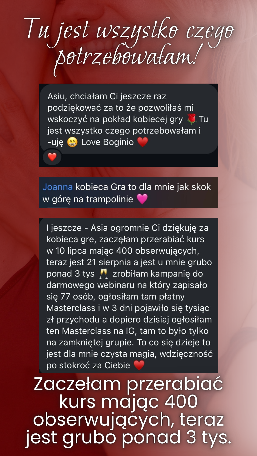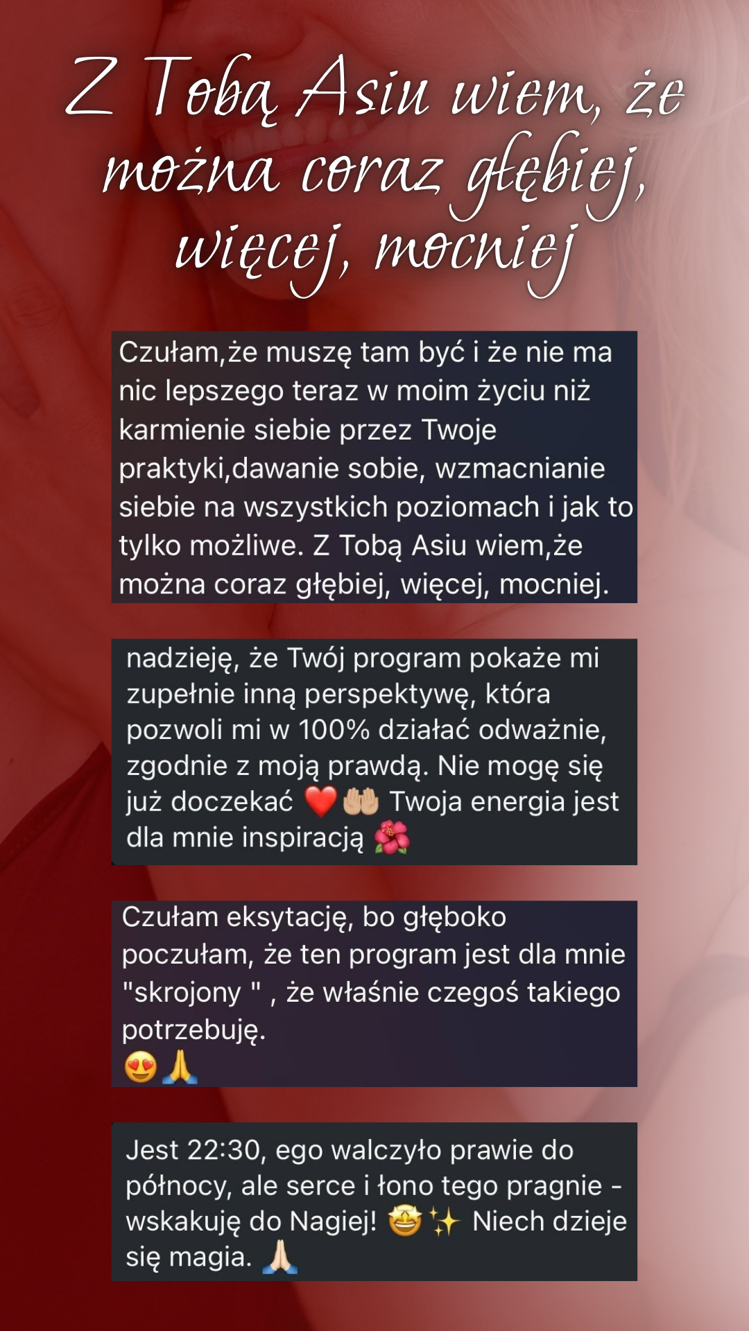 Wszystkie one wpierw wzniosły moje życie na szczyt, teraz wzbogacają moje wspaniałe Klientki, dając im głębokie efekty w obszarze rozwoju osobistego i biznesowego.
