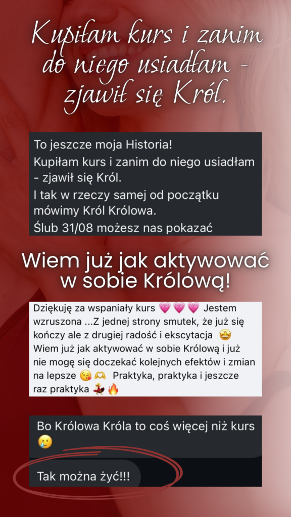 Dlatego wybierasz tworzyć PRAWDZIWĄ i PEWNĄ relację ze Sobą, by w efekcie mieć bogate życie. A w nim karmiące związki z tymi których kochasz. Ekscytację, satysfakcję i sens w pracy. Wolność finansową. Czas na pasje i podróże. Wiesz, że życie osobiste i kariera kwitną, gdy Ty kwitniesz, jako Królowa.